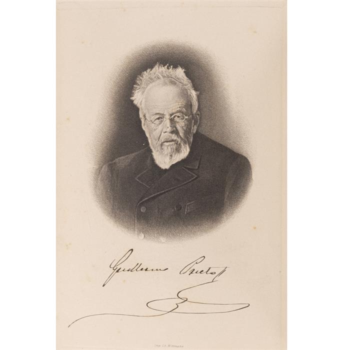 Prieto, Guillermo (Fidel). Memorias de Mis Tiempos 1828 - 1853. París - México: Librería de la Vda. de C. Bouret, 1906. 8o. marquilla, 380 + 447 p. Tomo I: De 1828 a 1840. Tomo II: De 1840 a 1853. Retrato del autor, con firma facsímil. Dos tomos en un volumen. Gracias quebradas; tres últimas hojas rasgadas, con pérdida de papel. Encuadernado en pasta dura, lomo en piel. Palau: 237027. Arregló el borrador de estas memorias Nicolás León. Memorias de Guillermo Prieto, en las que relata episodios de su vida, sus actividades como funcionario de gobierno y sus observaciones durante la guerra de México contra los Estados Unidos. Estimado $4,000-6,000