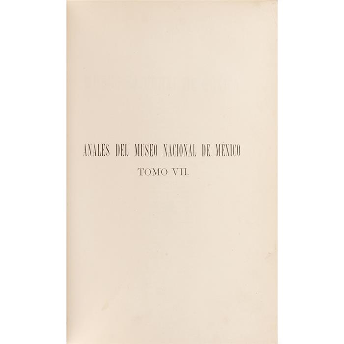 Subasta 1081, Lote # 321 Anales del Museo Nacional de México. Idolatrías y Supersticiones de los Indios / Boletín del Museo Nacional de México. México: Imprenta del Museo Nacional, 1900 / 1903. fo., 487 + 48 p. + 2 h. + 562 + 56 p. Tomos VI y VII. en un volumen. Tomo VI: Ponce, Pedro. Breve Relación de los Dioses y Ritos de la Gentilidad / Sánchez de Aguilar, Pedro. Informe Idolorvm Cvltores del Obispado de Yvcatan / Ruiz de Alarcón, Hernando. Tratado de las Supersticiones de los Naturales de esta Nueva España. Escrito en 1629 / Balsalobre, Gonzalo de. Relación de las Idolatrías de Oaxaca. Escrita en 1654 / Serna, Jacinto de la. Manual de Ministros de Indios. Escrito en 1656. Dos láminas / Feria, Pedro de. Relación que hace el Obispo de Chiapa sobre la Reincidencia de sus Idolatrías en los Indios de Aquel País Después de Treinta Años de Cristianos. Copia sin fecha. Facilitada por el Dr. Nicolás León para que se publique. Primera edición. Tomo VII: 11 láminas (Incluye un mapa plegado: Sinopsis de las familias idiomas y dialectos de las lenguas indígenas de México según la clasificación del Dr. Nicolás León. Bosquejo de la carta lingüística de México, según la clasificación del Dr. Nicolás León, 57 x 79.5 cm., desprendido, pequeños faltantes). Lomo gastado, por desprender. Encuadernado en pasta dura, Estimado $10,000-12,000