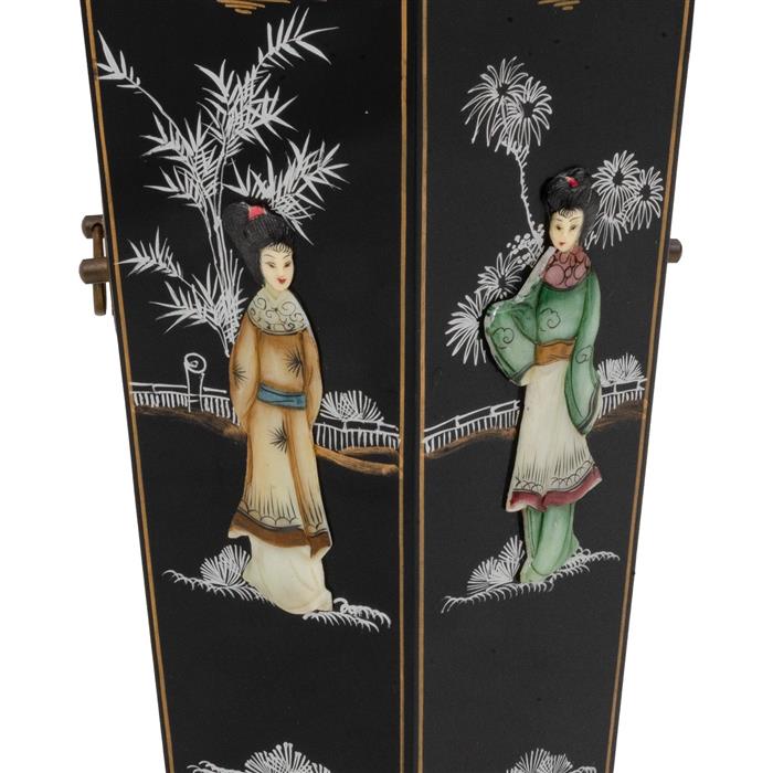 Madera ebonizada y laqueada; cuerpo hexagonal, aplicaciones de piedra jabonosa a manera de figuras de damas, detallados con paisajes pintados; interior con recubrimiento de lámina metálica