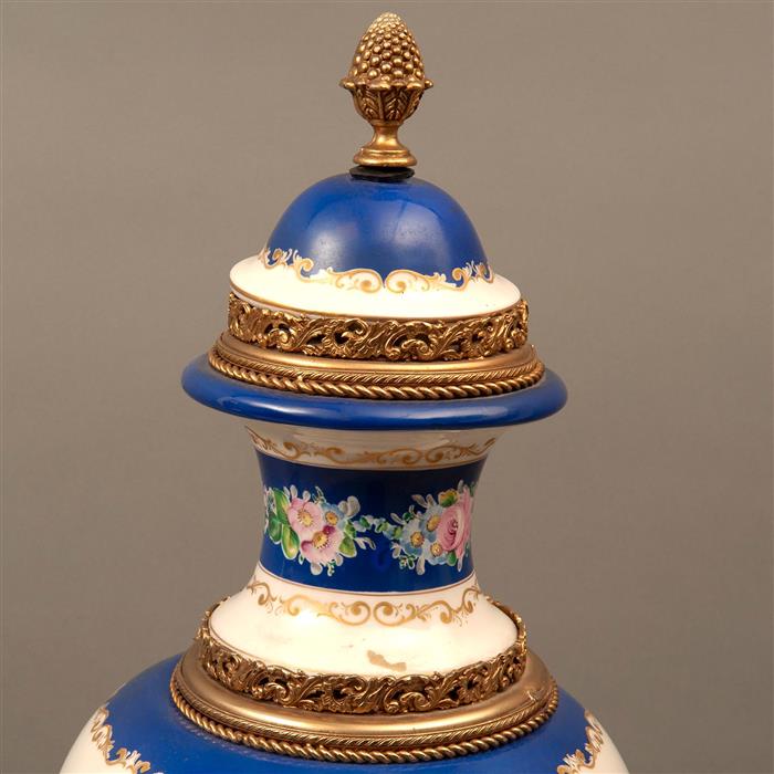 Decorado con elementos florales sobre fondo azul y esmalte dorado