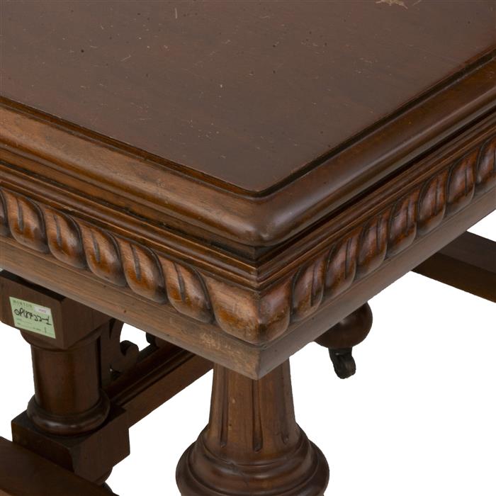 Elaborado en madera, con extensiones, soportes tipo bollo, fustes acanalados y espejo