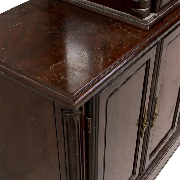 Cuenta con pináculo en friso, puertas abatibles, cajones y tiradores enchapados.