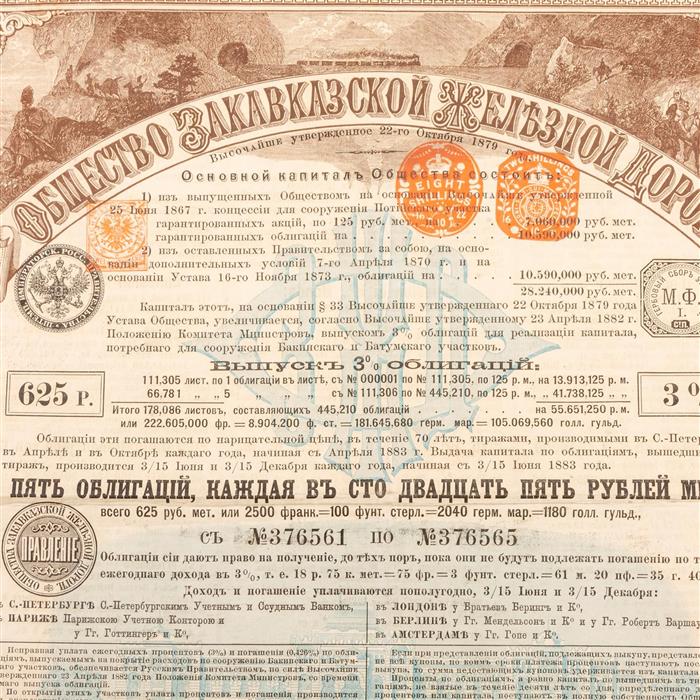 -Sociedad de Ferrocarriles Transcaucásicos. No. 56610. 125 y 625 P. Fianza de ciento veinticinco rublas de metal. Bono del 3%. San Petersburgo, 1882. Piezas: 2.