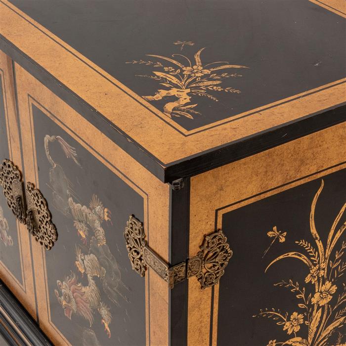 Cuenta con par de puertas abatibles con diseño de dragones y cubierta rectangular