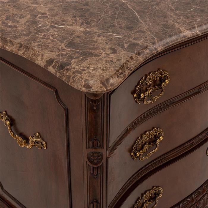 Cuenta con tres cajones con tiradores de metal dorado y soportes tipo cabriolé