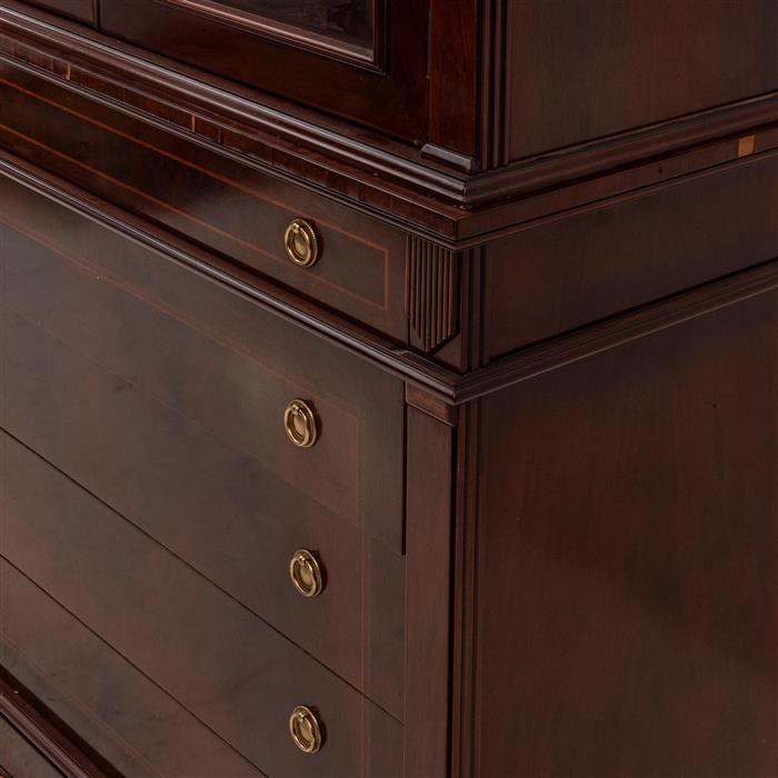 Cuenta con puertas abatibles de vidrio, 5 cajones con tiradores de metal dorado y soportes tipo zócalo
