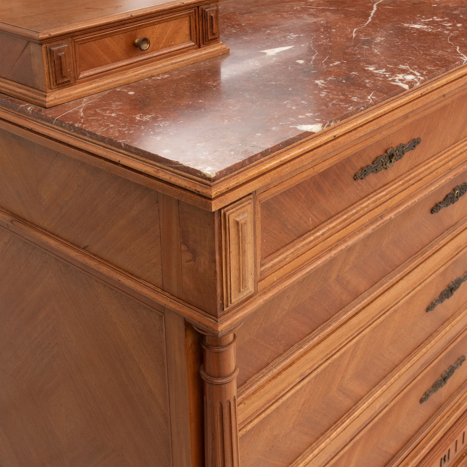 Cuenta con pináculos, molduras, luna de 3 capas de platinado, cubierta de mármol, compartimientos, cajones y soportes tipo carrete