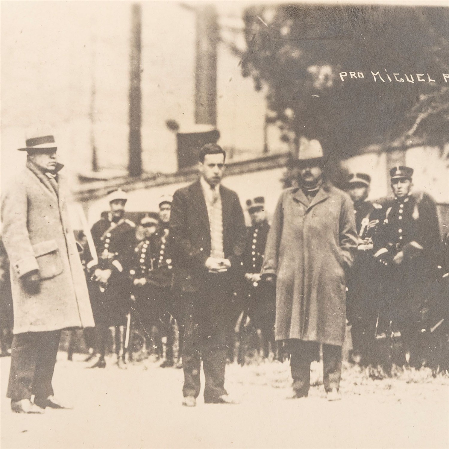 Subasta 1296T, Lote # 3 Fusilamiento del Padre Pro y los civiles Juan Tirado, Humberto Pro y Luis Segura Vilchis. Sepelio y cortejo fúnebre. 11 Fotografías en blanco y negro, 17.5 x 12.5 (9) Sello al reverso "AM PHOTO"; 9 x 13.5; 11 x 6.5 cm. / oración padre Pro. Total de piezas: 12. El sacerdote jesuita Agustín Pro Juárez y los civiles Juan Tirado, Humberto Pro y Luis Segura Vilchis fueron fusilados por haber estado implicados en un atentado dinamitero contra Álvaro Obregón, cuando en el Bosque de Chapultepec desde un auto Essex fue lanzada una bomba contra el coche en el que viajaba Obregón. Después de un tiroteo con la guardia del general, la policía capturó a Tirado Arias, quien dio la pista para la captura del Agustín Pro, ya que el vehículo Essex estaba registrado a nombre de Humberto Pro. Las investigaciones descubrieron que Luis Segura Vilchis; Juan Tirado Arias, Humberto Pro Juárez, Nahún Lamberto Ruiz, J. González y otros más, miembros de la Liga de Defensa Religiosa que se reunía en la casa número 44 de las calles de Alzate, arrendada por la señora Josefina Montes de Oca, sobrina del obispo Ignacio Montes de Oca, se habían propuesto asesinar al candidato presidencial. Estimado $4,000-8,000