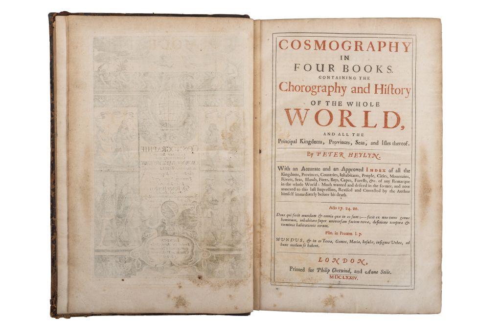Subasta 858, Lote # 100 B - Heylyn, Peter. Cosmography in Four books. Containing the Chorography and History of the Whole World, and all the Principal Kingdoms, Provinces, Seas, and Isles Thereof. London: Printed for Philip Chetwind and Anne Seile, 1674. fo. marquilla, 7 h. + 443 + 139-226 + 230 +162 p. + 20 h. Frontispicio y cuatro mapas plegados (Europa, Asia, África y América). Errores de paginación, en el apartado de Asia, de la página 86 sigue la 91, texto completo. Pastas y lomo gastados. Encuadernado en pasta dura. Sabin: 31655. Obra monumental sobre la geografía e historia de las diversas regiones y continentes del planeta. Respecto al continente americano, el autor realiza una descripción pormenorizada de su geografía, comenzando con la isla ficticia de "Estotilandia" -que supuestamente se localizaba en la porción boreal del continente- hasta llegar a la "Terra Australis Incognita", cerca del polo sur. En relación al territorio mexicano, describe las regiones de la California, Nueva Galicia y Nueva España. California la delinea -erróneamente- como una isla; sobre la Nueva España, hace mención de la planta del Maguey, a la que califica de "una curiosidad". Estimado $ 40,000-50,000