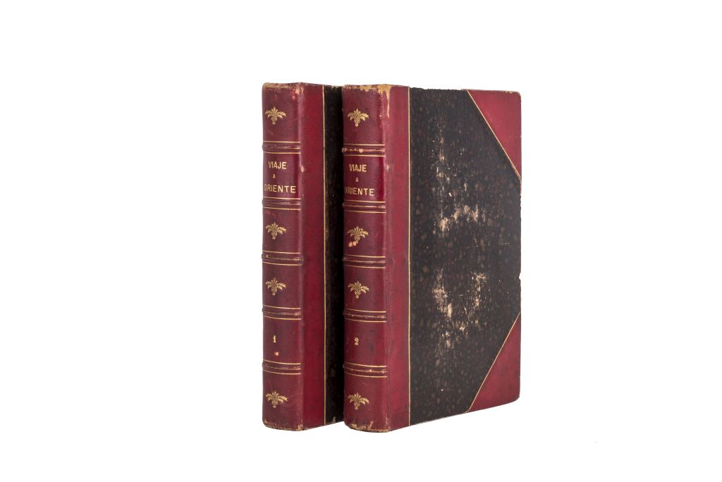 8o. marquilla, XXIX + 494; IX + 682 p. Tomos I - II. Tomo I: Tres láminas (Un retrato del autor); mal paginado. Tomo II: Dos láminas. Vistas de las ciudades del Cairo y Jerusalén. Encuadernados en pasta dura, lomo y puntas en piel. Piezas: 2.