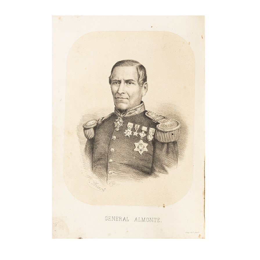 Subasta 961, Lote # 152 De Miramar a México. Viaje del Emperador Maximiliano y de la Emperatriz Carlota. Orizaba: Imprenta de J. Bernardo Aburto, 1864. 8o. marquilla, 412 p. + 2 h. Desde su Palacio de Miramar cerca de Trieste hasta la capital del Imperio Mexicano. Con una relación de los festejos públicos con que fueron obsequiados en Veracruz, Córdoba, Orizaba, Puebla, México y en las demás poblaciones del tránsito. Ilustrado con 4 retratos y dos vistas plegadas, litografías de Iriarte. Puntos de polilla, surco desde la página 395, hasta el final en punta superior, último tercio con mancha de humedad, pastas deterioradas. Encuadernado en pasta dura, lomo en piel. Estimado $8,000-10,000