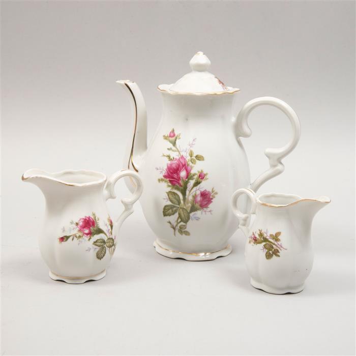 Consta de: tetera, cafetera musical, lechera, 2 cremeras, 2 azucareras, 4 tazas para té con 6 platos base, 5 ternos para café y 6 platos para postre.
