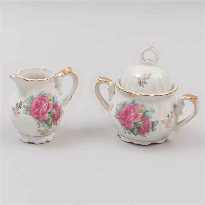 Consta de: tetera, cremera, azucarera, 4 tazas y 5 platos base.