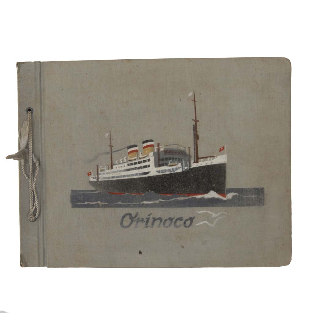 Subasta 1051, Lote # 308 Carguero "Orinoco". Álbum de Fotografías. Tampico, 1939. 8o. marquilla apaisado, 25 h. 209 fotografías, varios formatos. Pasta dura, en tela. Septiembre de 1939. Cuatro cargueros alemanes se encontraban atracados en los muelles de Tampico cuando en Europa estallo la segunda guerra mundial. Los capitanes de los barcos "Phyrgia", "Idarwald", "Orinoco" y MS Rehin", recibieron por cable la orden de permanecer en Tampico hasta nuevo aviso, pues el mar Atlántico era patrullado por cañoneros ingleses y holandeses prestos a disparar a cualquier embarcación germana. Durante más de un año estas embarcaciones no salieron del Puerto. En noviembre (1940), los capitanes recibieron órdenes superiores de salir de Tampico, tres de las naves se desplazaron sobre el Pánuco. El "Orinoco" no pudo seguirlos por causa de una avería (miembros de la tripulación habían destruido una pieza de la maquinaria). El "Phrygia", al parecer fue autodestruido por órdenes de su capitán ante la amenaza de un cañonero estadounidense que les salió al paso, regresando los otros dos buques a Tampico. El 29 de noviembre volvieron a salir el "Idarwald" y el "MS Rhein", esta vez alcanzando mar abierto, quedando el "Orinoco" en una zona del puerto, ubicada cerca la "Puntilla", pues no había manera de que zarpara sin la refacción que le faltaba y toda su tripulación estaba en calidad de refugiados de guerra. Pronto el barco se convirtió en una parte más de la ciudad, al estar por varios meses en el puerto, punto donde se desarrollaban bailes y otras actividades; sus tripulantes se hicieron vecinos de los tampiqueños de ese sector de la colonia Morelos y Cascajal, departiendo con los porteños a la espera de su destino. Estimado $18,000-22,000