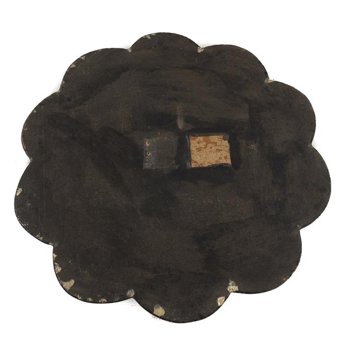 b) Mesa tilt-top en madera ebonizada con cubierta circular lobulada, fuste torneado y soporte trípode. Con cubierta desprendida en bisagra. Decorada con motivos orgánicos y florales en esmalte dorado.
