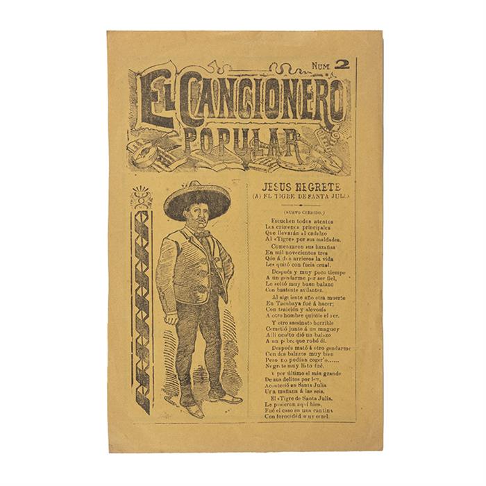 Posada, José Guadalupe.El Tigre de Santa Julia, Valientes, Fusilamientos, Toreros. México: Imprenta de Antonio Vanegas Arroyo, principios del Siglo XX. - El Sensasionalisimo Jurado de Jesús Negrete o sea "El Tigre de Santa Julia". - La Vida de un Bandolero, los Crímenes más Notables de Jesús Negrete (a) "El Tigre de Santa Julia". - Cancionero Popular. Jesús Negrete (a) "El Tigre de Santa Julia" (2). - Nuevos y Divertidos Versos de Un Valiente del Bajío y sus Valedores. - El Valiente de Guadalajara. - El Valiente Costeño (2). - Corrido de un Valiente Oaxaqueño. - Memorias y Recepción en los Profundísimos Infiernos del Bandido Nicolás Torres. - Fusilamiento de Florencio Morales y Bernardo Mora. - El Próximo Fusilamiento de José Prado en el Interior de la Cárcel de Belén. - Fusilamiento del Soldado del 2o. Batallón Regional Julio García. - El Fusilamiento del Soldado Bruno Apresa. En el Llano de la Vaquita, el día 29 de Abril de 1904 a las 6 de la Mañana. - Versos para Cantarse con el Popular Paso Doble Titulado Machaquito. - La Riesgosa Cogida de Rodolfo Gaona en la Plaza de "El Toreo" el Domingo 20 del pte. Mes (2). - Cancionero Popular. Muerte del Banderillero Alfredo Asturias, en la Plaza "El Toreo" de México. - Verdadero Versos de Macario Romero. - Corrido de la Vida de Santanon. Hojas Volantes. Varios formatos, 27.5 x 18.5 y 30 x 19.5 cm. Seis en marialuisa. Dos con manchas de humedad y dos con faltantes. Piezas: 20. Estimado $10,000-12,000
