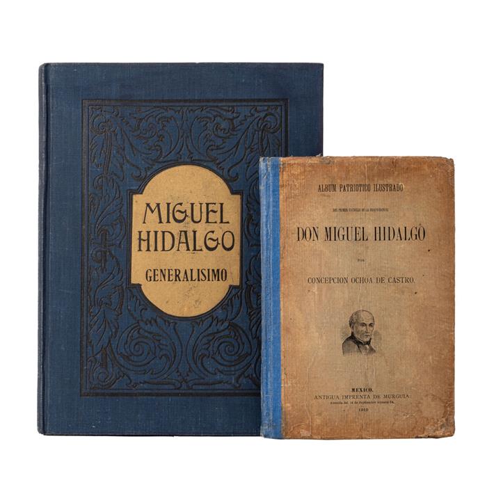 Subasta 1081, Lote # 81 Ochoa de Castro, Concepción / Castillo Ledón, Amalia. Álbum Patriótico / Miguel Hidalgo y Costilla Generalísimo. a) Ochoa de Castro, Concepción. Álbum Patriótico Ilustrado del Primer Caudillo de la Independencia Don Miguel Hidalgo. México: Antigua Imprenta de Murguía, 1910. 8o. marquilla, 87 p. 63 láminas. Páginas 31 - 34, intercaladas entre las páginas 60 - 61. Pastas deterioradas. Encuadernado en pasta dura. Obra editada en ocasión de los festejos del Centenario de la Independencia de México. b) Castillo Ledón, Amalia (Introducción). Miguel Hidalgo y Costilla Generalísimo. México: Microprotecsa - M. Quesada Brandi, 1962. 4o. marquilla, sin paginar. Edición de 500 ejemplares numerados 1 al 500, ejemplar sin numerar. Reproducción facsimilar. Encuadernado en pasta dura. Total de piezas: 2. Estimado $6,000-8,000