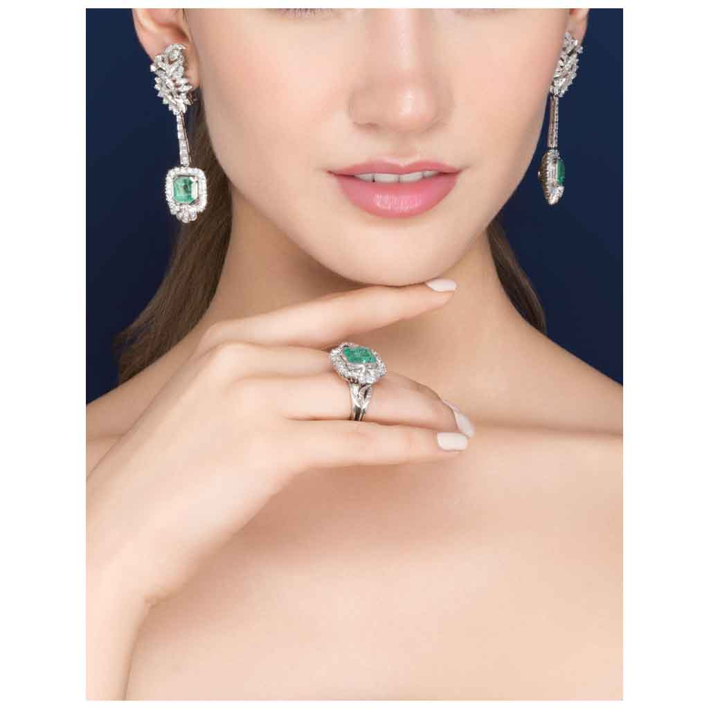 JUEGO DE ANILLO Y PAR DE ARETES CON ESMERALDAS Y DIAMANTES EN PLATA PALADIO