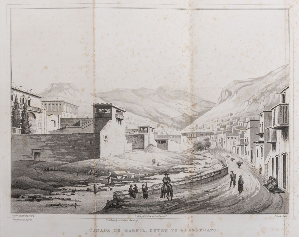 Subasta 858, Lote # 69 A - Obra Esencial para la Historia de México y una de las Narrativas más Valiosas de Viajeros en el País durante el Siglo XIX. Ward, Henry George. Mexico in 1827. London: Henry Colburn, 1829. 8o. marquilla, XXIV + 525; VII + 643 p. Second edition enlarged, with an account of the mining companies, and of the political events in that republic, to the present day. Tomo I: Cinco láminas (Frontispicio y una lámina plegadas); un mapa plegado, con rasgaduras restauradas, no afectan la imagen.Tomo II: Ocho láminas (Frontispicio y cuatro láminas plegadas, una a color); un mapa plegado, pequeñas rasgaduras en dobleces. Encuadernados en pasta dura, en piel. Piezas: 2. Palau: 374006. Ward, entró en el servicio diplomático en 1816, visita por primera vez México en 1823, como miembro de una comisión del gobierno británico, para evaluar la conveniencia de establecer relaciones comerciales con la nación mexicana tras su recién adquirida independencia. Ward promovió la firma de varios tratados entre Gran Bretaña y México: de amistad, comercio y migración. Gran Bretaña perdió gradualmente su influencia sobre México, a pesar de los mejores esfuerzos de Ward, esto en gran parte, debido a la influencia que ya ejercía el enviado americano Joel Poinsett. "Mexico in 1827" contiene una detallada descripción del territorio mexicano, la obra se encuentra ilustrada con dibujos hechos por su esposa, Emily Elizabeth Swinburne. El libro se convirtió rápidamente en una obra fundamental para los viajeros y comerciantes internacionales, por ser una temprana y crítica valoración de la incipiente nación mexicana, conteniendo detalles relativos al comercio, minería, topografía, costumbres, tradiciones, etc. Estimado $ 18,000-25,000