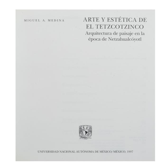 Subasta 1083T, Lote # 233 LIBROS SOBRE ARQUITECTURA MEXICANA Y PAISAJE. a) Medina, Miguel. Arte y Estética de El Tetzcotzinco. Arquitectura de Paisaje en la Época de Netzahualcóyotl. México: Universidad Nacional Autónoma de México, 1997 217 p. Primera edición. Edición de 1,000 ejemplares. Encuadernado en pasta dura, en estuche. b) Fernández, Martha. Artificios del Barroco. México y Puebla en el Siglo XVII. México: Universidad Nacional Autónoma de México, 1990. 185 p. Ilustrado. Encuadernado en pasta dura. c) Guzmán Peredo, Miguel. Paisajes e Imágenes de México. España: Círculo de Lectores, 1985. 199 p. Ejemplar nuevo. Encuadernado en pasta dura. d) Ramos Maza, Roberto. El Sureste Mexicano. Paisaje Natural. México: Grupo Azabache, 1992. 193 p. Chiapas. Tabasco. Campeche. Quintana Roo. Yucatán. Ilustrado en color y blanco y negro. Encuadernado en pasta dura. Total de piezas: 4. Estimado $600-800