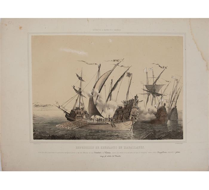 Subasta 1098T, Lote # 55 Urrabieta - Belvedere, Augusto de - Valdivieso. Litografías a color. 31 x 44.5 cm. (6), 31.5 x 43.5 cm., 30 x 45 cm. y 29.5 x 43 cm. Madrid: Lit de J. J. Martínez, 1854 - 1856. a) La Armada Naval Mandada por el Comendador García Loaisa.b) La Funesta Batalla del Cabo de San Vicente (repetida). Una con rasgadura restaurada en margen derecho, afecta poco imagen. c) Combate de Tolon (repetida). d) Combate de Tolon (lámina 2a.). Rasgadura restaurada en margen superior, afecta poco imagen. e) Expedición de Fernando de Magallanes (repetida). Una con pequeñas rasgaduras restauradas en margen superior. f) Ataque por los Ingleses a Buenos Aires. Partida por la mitad, restaurada. Sucias y mancha de humedad en esquina superior derecha. Piezas: 9. Tomadas de la obra: Ferrer de Couto, José - March y Labores, José. Historia de la Marina Real Española. Desde el Descubrimiento de las Américas hasta el Combate de Trafalgar... Estimado $1,000-2,000