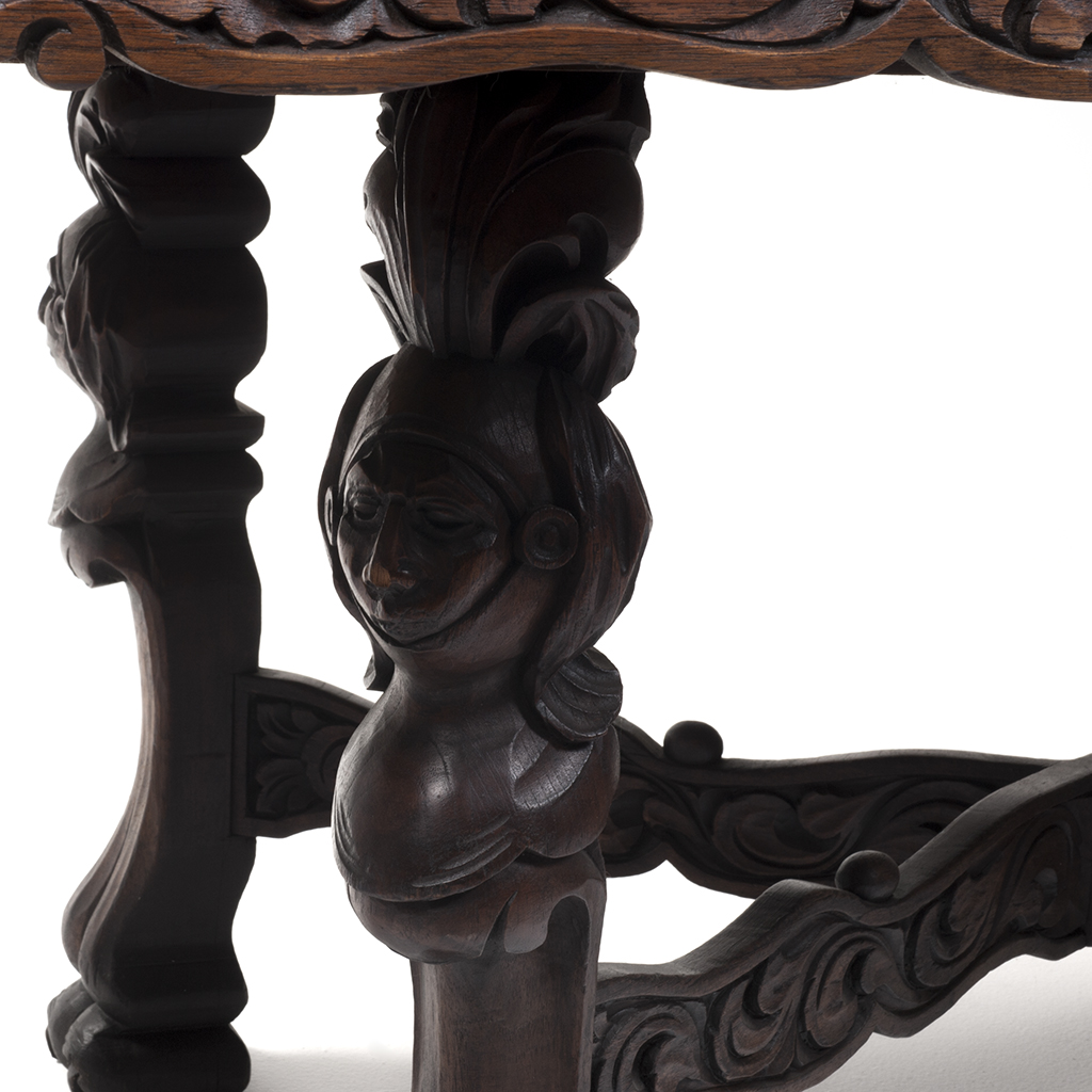 Subasta 898T, Lote # 225 Comedor. Siglo XX. Estilo Barroco Español. Elaborado en madera tallada. Decorado con rostros masculinos, mascarones híbridos, palmetas, acantos y rosetones. Consta de: a) Mesa. Con cubierta rectangular, chambrana en "X", soportes a manera de garra y sistema para extensiones. Incluye 2 extensiones. Dimensiones: 79.5 x 201 x 110 cm. b) 6 sillas y 2 sillones. Con respaldos y asientos en polipiel roja y soportes a manera de garra. c) 2 vitrinas. Diferentes diseños. 2 puertas y laterales con vidrio, 2 entrepaños, remate superior y soportes a manera de garra. Dimensiones: 173.5 x 117 x 43.5 cm. d) Cómoda. Con remate superior, 3 cajones y soportes a manera de garra. Dimensiones: 117 x 125.5 x 52 cm. e) Cómoda. Con 2 puertas, 3 cajones y soportes a manera de garra. Dimensiones: 123.5 x 174 x 57 cm. Presenta detalles de conservación, de estructura, fisuras, faltantes, marcas y desgaste. Piezas: 13 Estimado $ 30,000-40,000