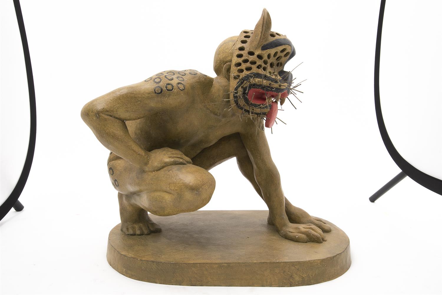 Subasta 916, Lote # 175 TIBURCIO ORTIZ (Santa Catalina Chinango, Oaxaca, 1945 - ) Guerrero jaguar de la noche Firmada Escultura en bronce II / XI Existe una versión monumental de esta pieza, la cual concursó en la década de los 90 por el 3 ° Premio Rodin celebrado en The Utsukushi-ga-hara, perteneciente al Hakone Open-Air Museum en Tokio, Japón. Posteriormente fue exhibida en el Museo de los Pintores Oaxaqueños en Oaxaca, México. El acercamiento e interés que ha tenido el Maestro Tiburcio Ortiz hacia las artes plásticas se manifestó desde que era un niño, pues construía sus propios muñecos y copiaba las estampas revolucionarias del maestro Alberto Beltrán. Años más tarde, en la Ciudad de México ingresó al ejército y al taller de la misma institución, donde hacía prótesis para manos y ojos, así como bustos de los personajes destacados de la historia de la patria. El encargado del taller, quien estudió en la Academia de San Carlos recomendó a Tiburcio Ortiz para que entrara a estudiar formalmente escultura. Ahí estudió de 1966 a 1970 con maestros como Manuel Silva Guerrero, Alberto de la Vega y Elizabeth Catlett, quienes le enseñaron a simplificar las formas con pocos recursos. "Tiburcio Ortiz, al modo de un monje que vive su ministerio en la creación de universos fantásticos, se dedica a rescatar las formas ancladas en el corazón de estos materiales duros [...] Primero escucha y después dialoga con esos gajos de mineral, ofreciéndonos una alteración dinámica de la figura humana (varonil, femenil) capaz de convivir con paisajes míticos y muestras de la flora y la fauna de su entorno". Luis Ignacio Sáinz. Fuente consultada: SÁINZ, Luis Ignacio et ál. Tiburcio Ortiz. Piedra-raíz. San Luis Potosí. Museo Federico Silva Escultura Contemporánea, 2016, Pág. 50. 47 x 44 x 30 cm USD $11,150-$16,670 Estimado $200,000-300,000