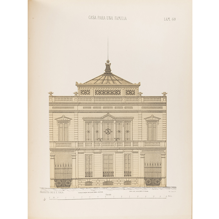 Subasta 1012, Lote # 159 Carpinell, Juan. Arquitectura Práctica. Álbum de Proyectos de Edificios Particulares Desarrollados para la Mejor Interpretación de los que se Dedican al Arte de Construir. Barcelona: José Serra, Editor, ca. 1880. fo. marquilla, 131 láminas + 136 p. Láminas numeradas del 1 al 99 (con 31 números "bis"), algunas a color. Obra útil a los arquitectos, maestros de obras, contratistas, constructores y en particular a los albañiles y propietarios de casas. Sellos de antiguo propietario. Pastas y lomo gastados; pasta posterior con pequeño faltante; gracia anterior quebrada, lomo desprendido. Encuadernado en pasta dura, lomo en piel. Estimado $4,000-6,000