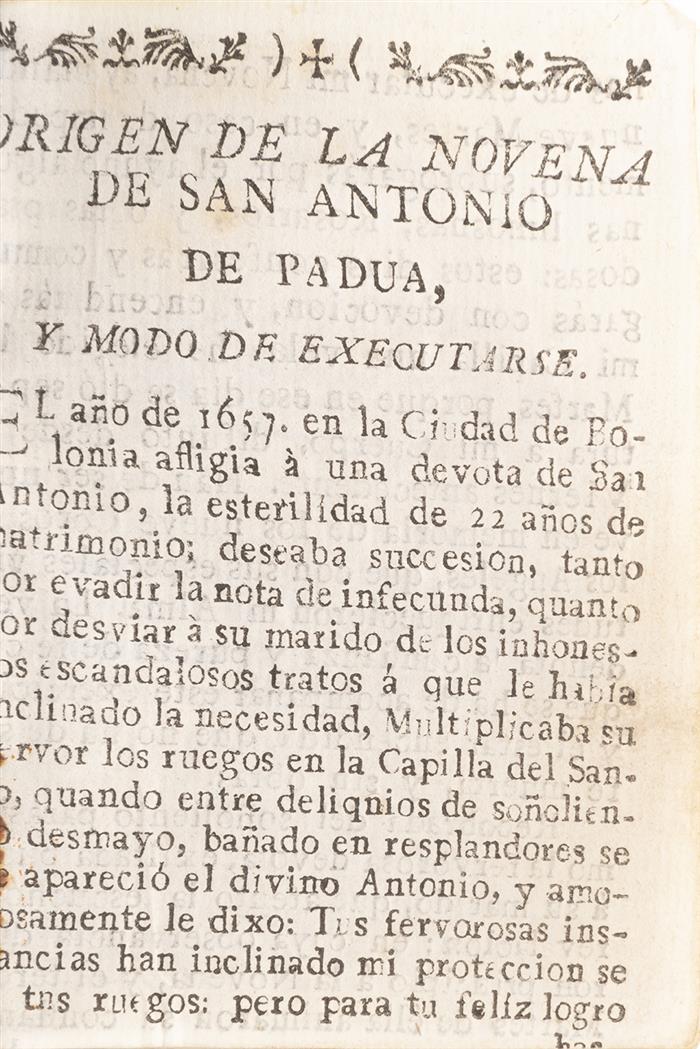 k) Novena que en Nueve Martes Pueden Hacer sus Devotos al Gloriosísimo Taumaturgo San Antonio de Padua. México: Oficina de Doña María Fernández Jáuregui, ca. 1810.