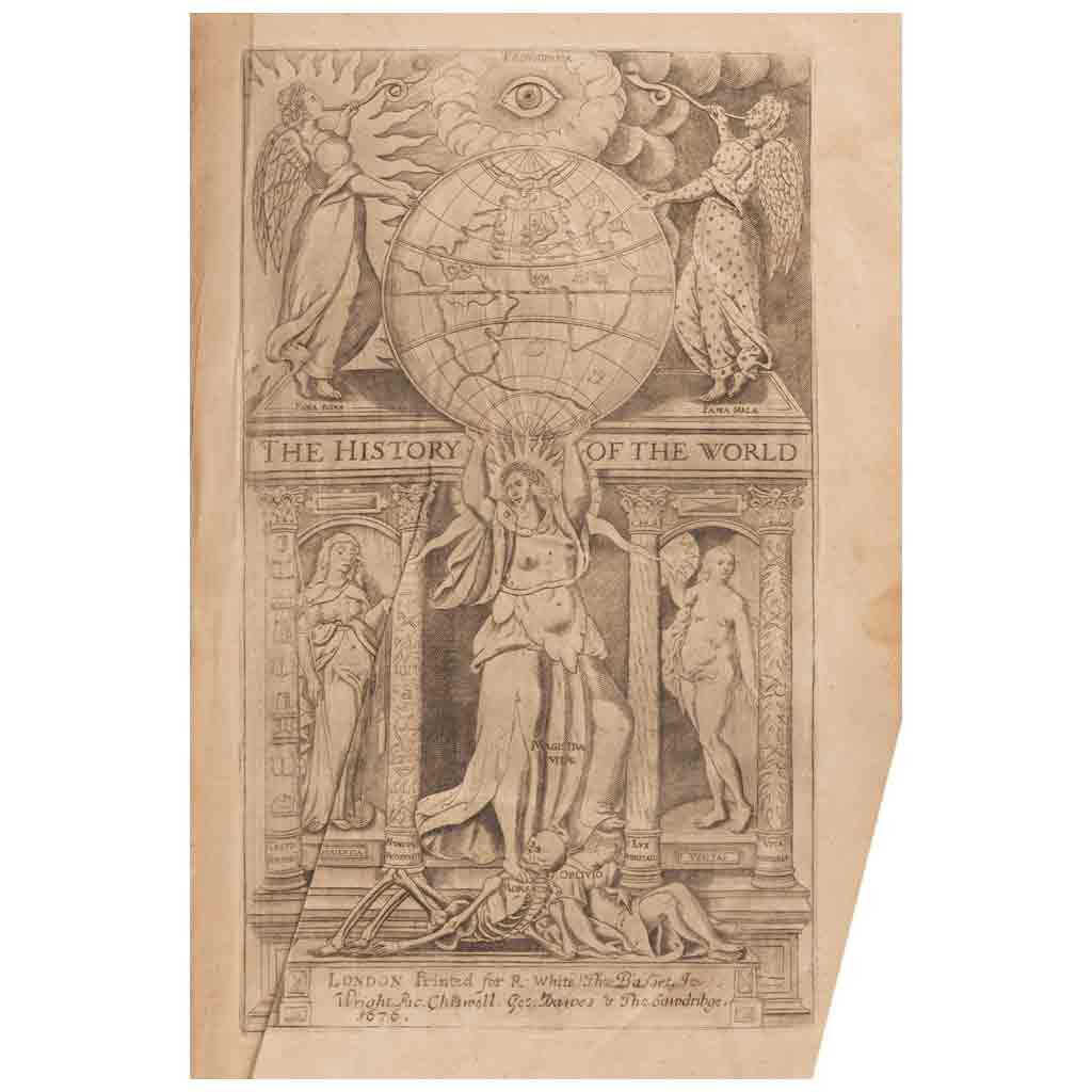 Subasta 986, Lote # 235 Raleigh, Walter. The History of the World in Five Books. Whereunto is added in this Edition, the Life and Tryal of the Author. London: Robert White, John Place and George Dawes, 1677. fo. marquilla, 54 p. + 22 h. + 376 + 393 - 480 + 569 - 660 + 577 - 885 p. + 14 h. (Tabla cronológica) + 9 h. (Índice). Frontispicio, portada ilustrada y ocho mapas plegados. Sellos de antiguo propietario. Errores de paginación: pasa de la página 10 a la 15 pero sin faltantes; se repiten páginas 118 y 119. Lomo y cajos restaurados. Encuadernado en pasta dura, en piel. Historia del mundo, dividida en cinco libros, escrita por el corsario y explorador inglés Walter Raleigh mientras se hallaba preso en la Torre de Londres. La obra inconclusa, abarca desde la creación del mundo hasta la historia de la Grecia y Roma antiguas. Walter Raleigh dedicó gran parte de su vida a buscar la mítica ciudad de "El Dorado". También se enfrentó en numerosas ocasiones contra las fuerzas españolas, teniendo una participación destacada en la guerra anglo-española. Obra de gran erudición, escrita a partir de diversas fuentes históricas, por una de las figuras más controvertidas de la Inglaterra de fines del Siglo XVI. Estimado $26,000-32,000