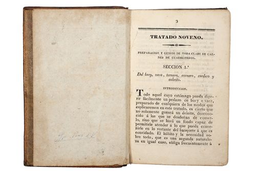 LZ - El Cocinero Mexicano. Colección de las Mejores Recetas para Guisar al Estilo Américano. México: Imprenta de Galván a cargo de Mariano Arevalo, 1831. 8o., 323 p. + 12 h. Y de las mas selectas según el metodo de las cocinas española, italiana, francesa e inglesa. Con los procedimientos más sencillos para la febricación de masas, dulces, licores, helados y todo lo necesario para el decente servicio de una buena mesa. Tomo II. Sin portada. Lomo y pastas gastadas. Encuadernado en pasta dura, en piel. Palau: 55879. Dice …para guisar al Estilo Mexicano. 3 tomos.