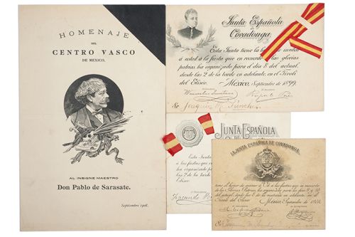LZ - La Junta Española de Covadonga y Centro Vasco. Invitaciones. a) La Junta Española de Covadonga. "... tiene el honor de invitar á Ud. á las fiestas que en recuerdo de las Glorias Patrias, ha organizado para los días 9 y 10 del actual, desde las 8 de la mañana en adelante, en el Tivoli del Eliseo.". México, Septiembre de 1904. Otras dos similares fechadas en México Septiembre de 1899 y 1900. Piezas: 3. b) Homenaje del Centro Vasco de México al Insigne Maestro Don Pablo de Saraste. "El Centro Vasco de México tiene el honor de invitar á Ud. á la misa que se celebrará el Domingo 4 de Octubre... por el eterno descanso del alma del eminente artista navarro, Don Pablo de Saraste...". México, Octubre 1o. de 1908. Con dos grabados. Total de piezas: 4.