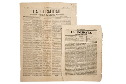 LZ - La Localidad / La Posdata. Periódicos Españoles. a) "La Localidad". Periódico Político y de Intereses Generales. Se publica seis veces al mes. Año V - Gran Canaria - Núm. 231. Las Palmas Junio 20 de 1883. Se destaca un Artículo de la primera plana: "Carta de la Viuda de Maximiliano a la Duquesa de Aosta, Reina Electa de España". Con rasgaduras y anotaciones manuscritas en lápiz y tachaduras en tinta. b) "La Posdata". Periódico Joco - Serio. Madrid. Martes 27 de mayo de 1845. No. 1012 - 8 cuartos. Total de piezas: 2.