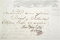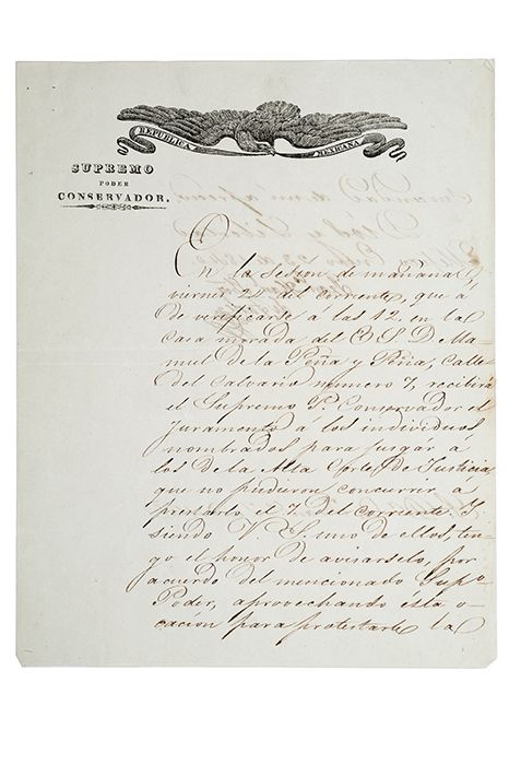 LZ - Sánchez de Tagle, Francisco Manuel. Carta dirigida al S. Dr. D. Francisco Zendalla. "En la sesión de mañana, viernes 24 del corriente, que á de verificarse á las 12, en la casa morada del E. S. D. Manuel de la Peña y Peña, calle del Calvario numero 7, recibirá el Supremo P. Conservador á las individuos nombrados para jusgar a los de la Suprema Corte de Justicia, que no pudieron concurrir á prensarlo el 7 del corriente y siendo U. S. uno de ellos, tengo el honor de avisarlo...". México Enero 23 de 1840. Firma. Estimado $1,500-2,000