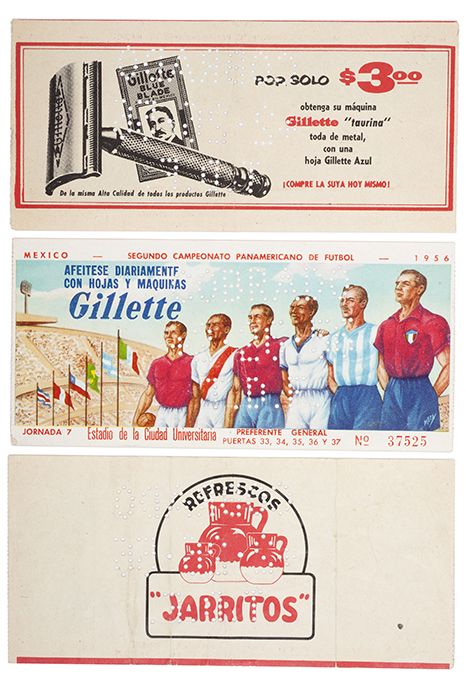 Lote de boletos. México - Segundo Campeonato Panamericano de Futbol, 1956 Boletos para las Jornadas 7 y 8. Estadio de la Ciudad Universitaria. Jornada 7 - Preferente general, números 37524 y 37525. Jornada 8 - Preferente general, número 39561. Impresiones en color, firmadas "Meza". Piezas: 3 Estimado $400-800