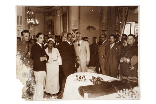 LZ - Agustín Lara, Toña la Negra y Miguel Alemán. Fotografía. 34 x 27. cm. A la derecha y a espaldas de M. Alemán, Lázaro Cardenas. Falto de esquina inferior derecha, deteriorada por humedad.