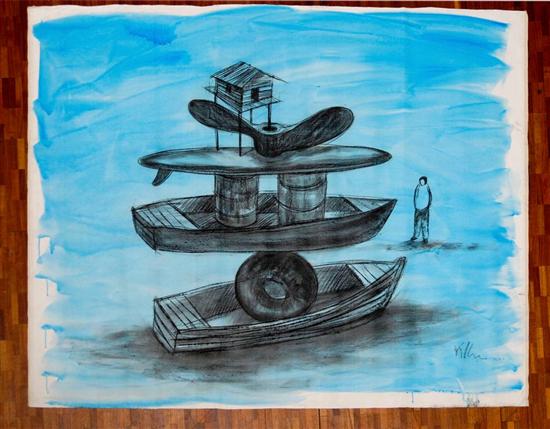 ALEXIS LEYVA MACHADO "KCHO" Sin título, 2000 Firmada. Mixta sobre tela. Con certificado de autenticidad del artista. ¿Por qué las migraciones son una constante en tu obra? Kcho: "El mundo contemporáneo está hecho de migraciones. La gente viaja tratando de mejorar sus condiciones de vida. Los grandes movimientos humanos son cada vez mayores. Y sean cuales sean las razones de esos desplazamientos, siempre hay alguien cercano que es parte de eso. Cualquier familia cubana tiene a alguno de sus miembros lejos o que se ha lanzado al mar, tratando de llegar a EE.UU. Eso es parte de la vida diaria. Y el cubano es muy familiar. Toda la felicidad y la tristeza de su gente le son cercanas. Y esas personas que se separan no desaparecen. No pueden ser obviadas. Porque marcan la vida, también marcan la historia. Me gusta tener la posibilidad de dedicarle un espacio a esa problemática tan universal. Es mi manera de aportar un poco de luz en algunas partes de esa historia que hay que respetar. Porque ninguna sociedad justa puede olvidar a alguien." Véase: MUÑOZ, Mario Jorge. "Kzando a Kcho." La Habana, Cuba. La Jiribilla revista de cultura cubana #186, 2004. 145 x 166 cm Estimado $120,000-150,000