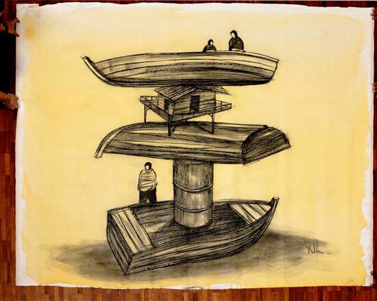 Subasta 612, Lote # 101 ALEXIS LEYVA MACHADO "KCHO" Sin título, 2002 Firmada. Mixta sobre tela. Con certificado de autenticidad del artista. (N. Nueva Gerona, Isla de la Juventud, Cuba, 1970 - ) "La primera clase de dibujo que me cambió la vida me la dio mi mamá cuando tenía 13 años. Así que yo dibujo hoy gracias a esa clase. Aquel día le tuve miedo al acto de crear, pero me gustó. Mi mamá me cogió la mano, me hizo lo que yo quería dibujar, e inmediatamente lo rompió. Y me dijo: ahora hazlo tú. "La influencia de mi familia ha sido total. Cada cosa que define mi trabajo tiene que ver con mi casa. Y es que en ella se respiraba arte. Para una de las cosas que me sirvió la escuela fue para darme cuenta de que mi entorno familiar era único. La escuela me ayudó a mirar más a mi casa." Kcho. Véase: MUÑOZ, Mario Jorge. "Kzando a Kcho." La Habana, Cuba. La Jiribilla revista de cultura cubana #186, 2004. 145 x 166 cm Estimado $120,000-150,000