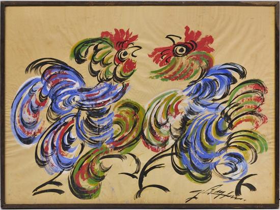 Subasta 612, Lote # 189 JESÚS REYES FERREIRA "CHUCHO REYES" 2 gallos Firmado. Gouache sobre papel Kraft. (N. Guadalajara, Jalisco, 1882 - Ciudad de México, 1977) "Mi primer maestro, y no porque él quisiera enseñarme nada, fue Jesús Reyes Ferreira. Su casa siempre me pareció la casa de un brujo: un mundo mágico de esferas de cristal, de manitas de marfil y de patitas de santo. Tenía libros muy hermosos, colecciones de tallas en marfil, de piedras, de zapatos, de todo lo inimaginable. Allí me encontré con reproducciones de Giotto, de Piero de la Francesca y de Fra Angélico y supe que existían Francia e Italia. Desde entonces empecé a tener amor por todas las cosas del pasado. Chucho era un joven anticuario que me dio mis primeras lecciones de belleza." Juan Soriano. 69 x 94 cm Estimado $40,000-60,000
