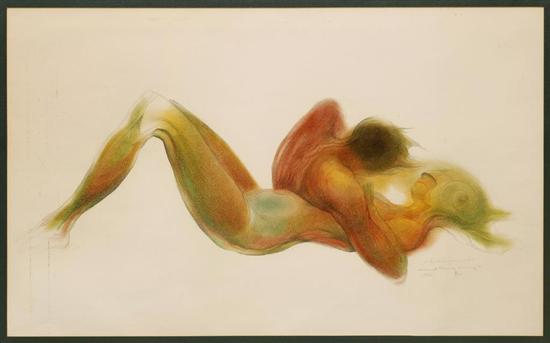 GUILLERMO MEZA Pareja Firmada y fechada 1969. Dibujo a lápices de color sobre papel. Con dedicatoria: "a Pepita con amor constante". (N. Ciudad de México, 1917 - Ciudad de México, 1997) "No podría decirse que Guillermo Meza es un nihilista; su visión del amor en la pareja humana tiene la proyección hacia el futuro, hacia ese -está a punto de suceder.-" Raquel Tibol, 1966. 56.5 x 92.5 cm Estimado $30,000-40,000