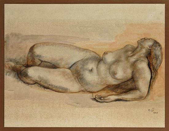 Subasta 612, Lote # 170 FRANCISCO ZÚÑIGA Desnudo reclinado Firmado y fechado 1966. Acuarela y carbón sobre papel. Con certificado de autenticidad de Galería de Arte Misrachi, octubre de 1993. Agradecemos al Sr. Ariel Zúñiga por la verificación de autenticidad de esta obra, octubre de 2011. (N. San José de Costa Rica, 1912 - México, 1998) ¿Por qué mujeres? Y es engañoso porque es puramente accidental, la necesidad natural en él de expresarse gráficamente lo conduce en busca del elemento más rico posible a su alrededor; no en balde en la tradición del arte es la figura femenina la que domina. No podemos ignorar que las juchitecas o yucatecas son suficientemente ricas para estar en el primer plano del arte mexicano; la fuerza del matriarcado es tan real que tiene una poderosa presencia desde el arte prehispánico. Véase: ZÚÑIGA, Ariel, et al. "Francisco Zúñiga. Catálogo Razonado. Volúmen III: Dibujos 1927 - 1970." México. Ed. Albedrío - Fundación Zúñiga Laborde, A.C., 2006. 49.5 x 64 cm Estimado $120,000-150,000