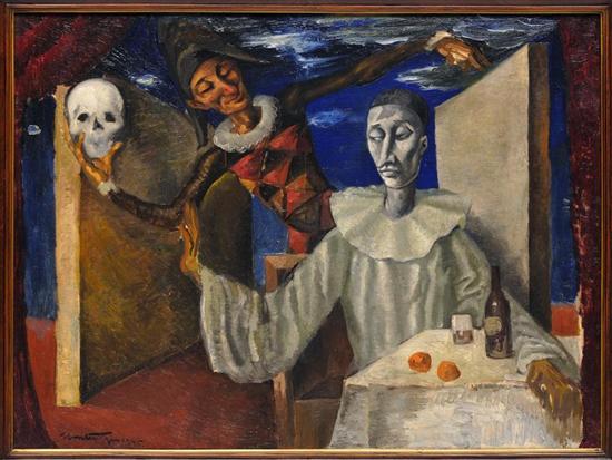 Subasta 612, Lote # 32 ROBERTO MONTENEGRO Pierrot con calavera Firmado y fechado 1945. Óleo sobre tela. Con certificado de autenticidad de Antigüedades Imperio. A lo largo de su vida, Montenegro vivirá en "el desconcierto de las intenciones", entre el amor por lo clásico y el gusto incontenible por lo moderno, y esta duda o esta oscilación, traducidas pictóricamente, contribuyen a la injusticia crítica ante su obra. Se tiende a ignorar sus grandes cuadros, sus grabados y dibujos excepcionales, sus retratos asombrosos, su virtuosismo. Es en este sentido un gran artista desconocido con un trabajo escindido entre la perfección académica y la experimentación. En diversos momentos, Montenegro se "contradice" y revela sus afinidades sucesivas y simultáneas con la pintura académica española, el Art-Noveau, la pintura renacentista, incluso el arte caricatural de los expresionistas. Todo esto lo define como un pintor que esquiva la originalidad, o, más exactamente, como un pintor atento sobre todo al despliegue de sus dones, al margen de las corrientes pictóricas y de las obsesiones del estilo. Véase: MONSIVÁIS, Carlos. "Roberto Montenegro. El pintor muy conocido, el gran artista desconocido." en: "Roberto Montenegro. La sensualidad renovada.". México. Fondo Editorial de la Plástica Mexicana, 2001. Pág. 12. 48 x 64 cm Estimado $200,000-300,000