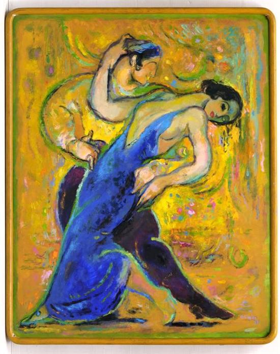 Subasta 612, Lote # 8 JOSÉ GARCÍA OCEJO Dolores baila el tango Firmado y fechado 86. Óleo sobre masonite. Con certificado de autenticidad del artista, enero de 1993. Agradecemos al Maestro José García Ocejo por la verificación de autenticidad de esta obra, octubre de 2011. "Mis cuadros son interpretaciones libres de todos los personajes que conocemos, aquí podemos ver momentos importantes tanto de una obra dancística, como de una novela, o bien, la imagen de un personaje histórico. Incluso de mujeres que también, al adquirir las características de un hombre, se convierten en un dandy, es decir, en un personaje de sí mismo que es llevado al extremo de su conducta, de su aspecto, de su belleza, por eso me parecen una fuente de inspiración plástica llena de opciones.", José García Ocejo. Véase: MACMASTERS, Merry. "Por fortuna existen la crítica y el público, pero éste es el que cuenta: García Ocejo." México. Diario La Jornada, sección Cultura, 13 de enero de 2009. 100 x 80 cm Estimado $90,000-120,000