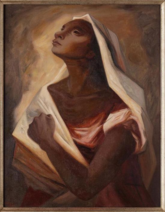 Subasta 612, Lote # 21 JESÚS GUERRERO GALVÁN Mujer con manto Firmado y fechado 1952. Óleo sobre tela. Con certificados de autenticidad del Instituto Nacional de Bellas Artes, febrero de 1991 y de Galería de Arte Misrachi, mayo de 1994. En general, en la pintura del artista se observa una recurrencia casi exclusiva por la representación poética de la realidad del niño mexicano y la mujer sola, mujer que ante todo es madre. Se observa una inocencia absoluta, la cual se reafirma al situarlos dentro de espacios austeros, carentes de tentaciones; la ambientación hace sentir como si esos niños habitaran en el limbo. Estas obras revelan una armonía entre lo espiritual y lo terreno; los personajes son seres de este mundo, y sin embargo, parece como si estuvieran en estado de gracia. En sus retratos se advierte el lirismo y la sensibilidad artística que caracterizaron los trabajos de este destacado pintor que construyó un terreno propio, el suyo, que él mismo modificó a su libre albedrío, ese terreno que lo llevó a ocupar un lugar dentro de la elite de los grandes maestros del arte mexicano. Véase: LARA ELIZONDO, Lupina "Visión de México y sus Artistas. Tomo I." México. Promoción de Arte Mexicano, 2000. pp. 226-227. 70.5 x 55.5 cm Estimado $180,000-250,000
