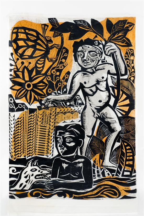 Subasta 612, Lote # 134 ANTONIO BERNI Juanito bañándose Firmada. Xilografía sobre tela. (N. Rosario, Santa Fe, Argentina, 1905 - Buenos Aires, Argentina, 1981) En 1925 consiguió una beca para estudiar en Europa, permaneció tres meses en Madrid. Durante este tiempo viajó a Toledo, Segovia, Granada, Córdoba y Sevilla. En febrero de 1926 se marchó a París, donde vivió hasta 1931. Allí descubrió las vanguardias y frecuentó el Grupo de París, integrado por artistas argentinos, e inició una sólida amistad con el pintor Lino Eneas Spilimbergo. De la mano de Max Jacob se introdujo en el grabado, y en 1929 se relacionaba con los círculos surrealistas, estilo que inspiró su obra durante la década de 1930. Berni está considerado como uno de los primeros artistas surrealistas latinoamericanos. Desde París realizó viajes a Italia, Bélgica y Holanda. Tras su regreso a Argentina en 1930, colaboró con Spilimbergo y David Alfaro Siqueiros en la realización de un mural y evolucionó hacia un realismo social narrativo del que fue uno de los más destacados representantes. En la década de 1950, sus obras adquirieron un carácter dramático y expresionista e inició una serie de paisajes suburbanos donde los personajes están ausentes. Al comienzo de la década de 1960 su obra se orientó hacia el expresionismo, para más tarde desembocar en una síntesis entre el Pop Art y el realismo social. 150 x 104 cm Estimado $30,000-50,000
