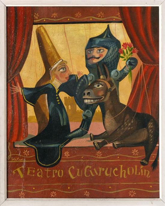 Subasta 612, Lote # 16 LOLA CUETO Teatro cucurucholín Firmado. Óleo sobre tela. (N. Ciudad de México, 1897 - Ciudad de México, 1978) "Desde chica me gustó el dibujo y la pintura y todo lo que se relacionara con el arte. Fui contemporánea de los tres grandes y trabajé junto a Orozco, Rivera y Siqueiros. En la escuela, siempre me encargaban que hiciera yo los mapas y los dibujos en grande en el pizarrón. Un profesor me aconsejó que entrara en la Escuela de San Carlos […] yo fui la única mujer en la Escuela de Pintura al Aire Libre, la primera escuela que se inició bajo la dirección del maestro Alfredo Ramos Martínez. Entonces, me lancé a la pintura." Lola Cueto, 1956. "Y con ese instinto de artesanía, con esa intuición suya del carácter y la naturaleza del oficio, Lola Cueto dio nueva vida a una de las artes populares de México: los títeres. Lola ha comprendido y resucitado en forma y espíritu la esencia sustantiva del teatro de muñecos. Ella no sólo es uno de los actores invisibles. Ella misma en colaboración con otros artistas, diseña las decoraciones y los muñecos. Faena minuciosa de artesano, ejecutada con el esmero y la sobria pasión del maestro que cuida de su trabajo de precisión. Y al mismo tiempo con la intuición del artista que sabe animar la materia, que sabe infundir a estas pequeñas figuras de una intensa fuerza de expresión." Paul Westheim, 1943. Véase: "Lola Cueto. Trascendencia Mágica, 1897-1978." México. INBA - Museo Mural Diego Rivera, 2009. 50 x 40 cm Estimado $25,000-35,000