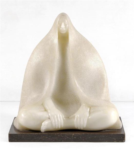 FELIPE CASTAÑEDA Meditación Firmada y fechada 1976. Escultura en ónix blanco. Agradecemos al Maestro Felipe Castañeda por la verificación de autenticidad de esta obra, septiembre de 2011. (N. La Palma, Michoacan 1933 - ) "La sencillez con que concibe sus obras se combina con la ternura que emana de esos cuerpos -casi siempre femeninos- flotando en una ola de tranquilidad. Rostros, manos, senos, piernas, caderas, despiden una energía mágica, desbordada como un velo que los mantiene dentro del ámbito de la belleza." Alí Chumacero. 50 x 45 x 22 cm Estimado $120,000-150,000