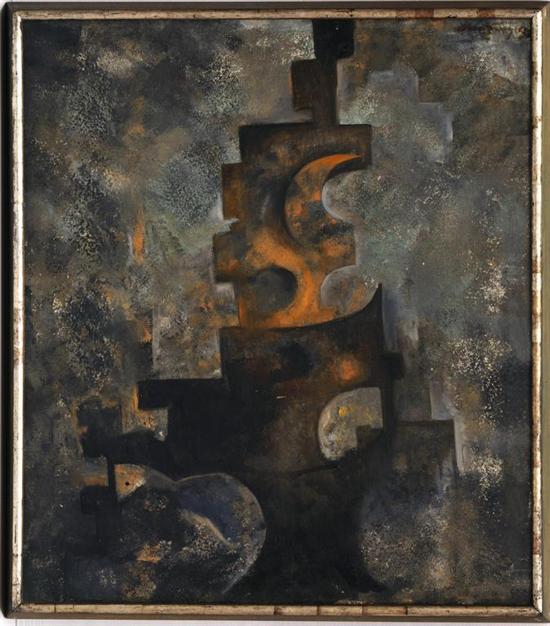 ROBERTO MONTENEGRO Construcción Firmado. Óleo sobre tela. Con etiqueta del Instituto Nacional de Bellas Artes. Presenta detalles de conservación en la capa pictórica. "Su obra variada y múltiple, diversa y cambiante, está presidida y ha sido ejecutada bajo el signo de la curiosidad. Y la curiosidad es la madre de todas las aventuras y el motor de todos los riesgos, de todos los viajes del espíritu. Ni la quietud ni la prudencia tienen nada que ver con este artista que ha recorrido todos los riesgos, que ha probado todas las aventuras, que ha emprendido todos los viajes, de los que no ha regresado sino para cambiar de dirección, correr un nuevo riesgo y emprender un nuevo viaje." Xavier Villaurrutia. 79 x 68.5 cm Estimado $200,000-300,000