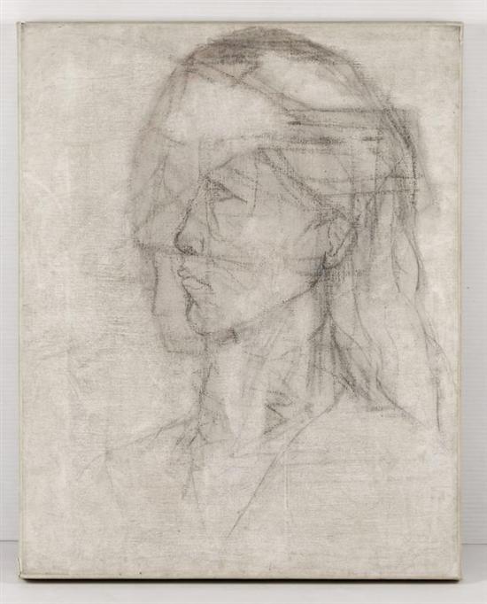 DIEGO RIVERA Boceto para el retrato de Ana Mérida, Ca. 1952 Carbón sobre tela. Con certificado de autenticidad de origen de Juan Coronel Rivera. Agradecemos a Juan Coronel Rivera por la verificación de autenticidad de esta obra, octubre de 2011. Con etiqueta Museo Estudio Diego Rivera y Frida Kahlo exposición "Ay, ay, ay... las mujeres: Diego Rivera y sus modelos." 2002-2003. "Era un gran mentiroso, un gran farsante, un gran pintor. Dejó una obra colosal, muy importante en sí misma, como arte y con significación extrapictórica en el terreno de la creación de un sentido de nacionalidad." Luis Cardoza y Aragón. 54 x 43 cm Estimado $100,000-150,000