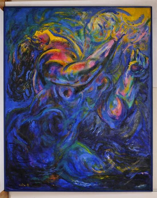 Subasta 612, Lote # 6 JOSÉ GARCÍA OCEJO Mujer telúrica Firmado y fechado 87. Óleo sobre tela. Con certificado de autenticidad del artista. Agradecemos al Maestro José García Ocejo por la verificación de autenticidad de esta obra, octubre de 2011. (N. Córdoba, Veracruz, 1928 - ) En 1935, su familia se trasladó a Saltillo donde cursó su educación básica. Más tarde, viaja a la ciudad de México y en 1946 ingresó a la Facultad de Arquitectura, que entonces compartía el Plantel de San Carlos. En 1947, realizó la decoración para el baile anual de San Carlos al cual asistió Diego Rivera, quien se interesó en su trabajo y lo convenció para que abandonara la carrera de arquitectura y se dedicara a la pintura. En 1953 viajó a Madrid donde estudió dibujo y pintura en el Círculo de Bellas Artes. En 1964 ingresó a la Sommer Akademie de Salzburgo, deseoso de estudiar con el maestro Oskar Kokoschka. Dos años después realizó su primera exposición individual en el Palacio de Bellas Artes de la ciudad de México y también presentó su obra en la galería Kaigado en Tokio. Véase: TOVAR Y DE TERESA, Guillermo. "Repertorio de Artistas en México". Tomo II. México. Grupo Financiero Bancomer, 1996. pág. 58. 255 x 208 cm Estimado $220,000-300,000